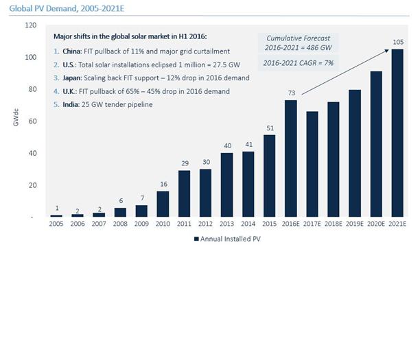 根據(jù)GTM最新發(fā)布的太陽能需求監(jiān)測報(bào)告來看,2016年,全球新增太陽能裝機(jī)容量將比去年增長43%,達(dá)到73吉瓦。